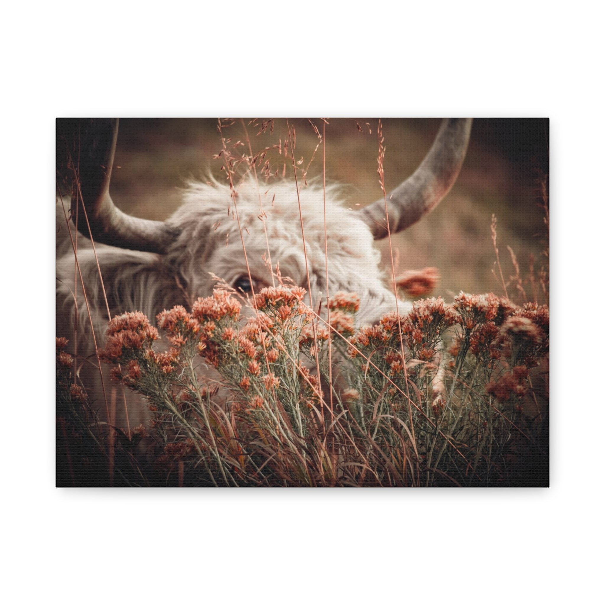 A quiet, rustic canvas print that brings a soft, pastoral mood into any room. The matte stretched surface mutes glare and deepens warm tones, letting the shaggy highland cow peek through amber wildflowers and tall grass. Lightweight yet sturdy, the cotton-poly canvas is wrapped over FSC pine and arrives ready to hang with back hardware and soft rubber support dots to keep it steady. Choose from multiple orientations and sizes to fit a cozy reading nook, farmhouse kitchen, or entry wall where calm, nature-driven character belongs.