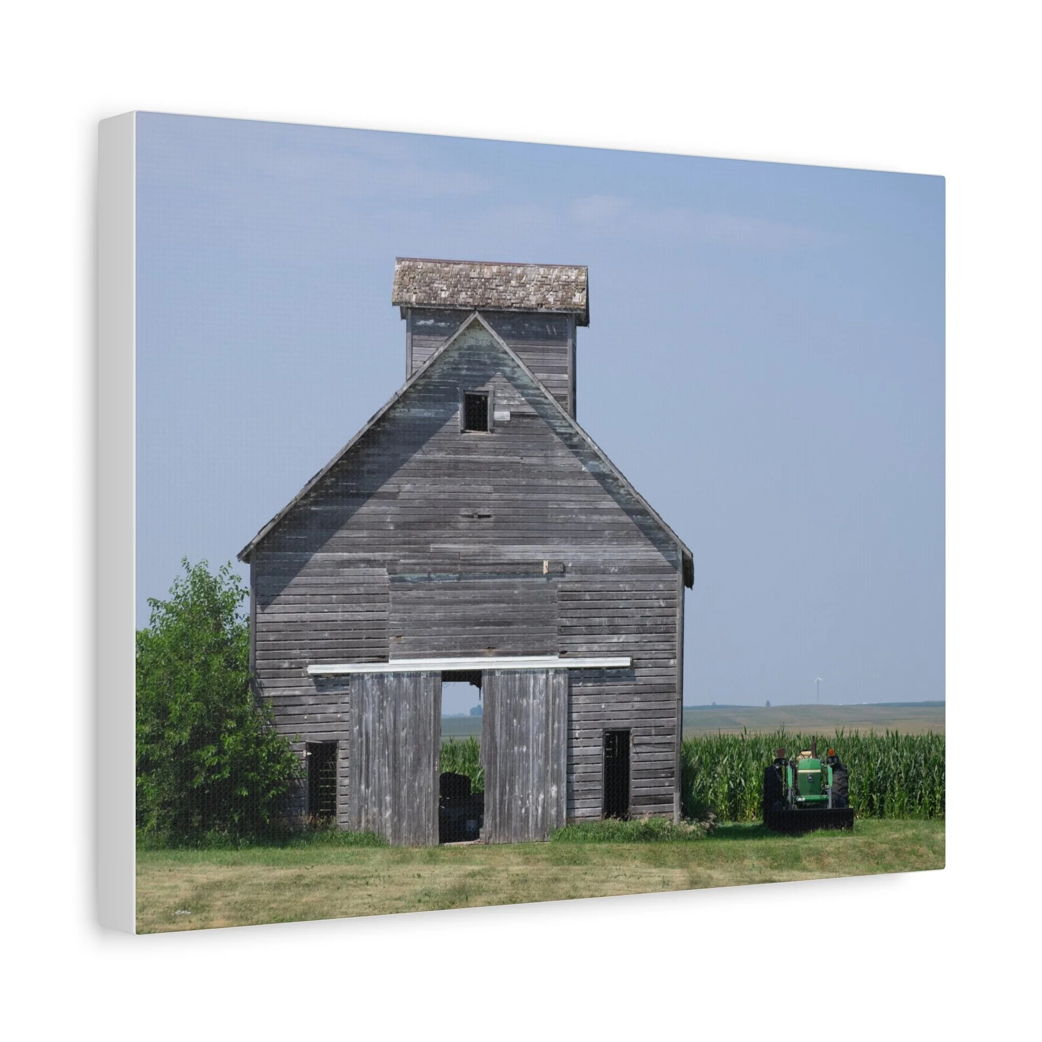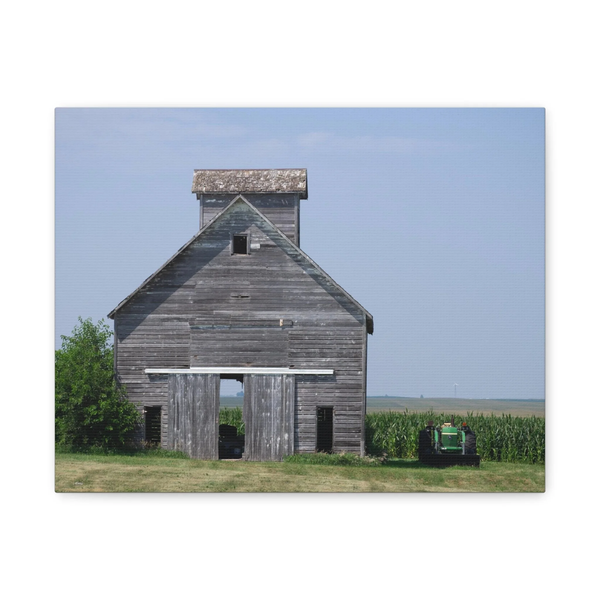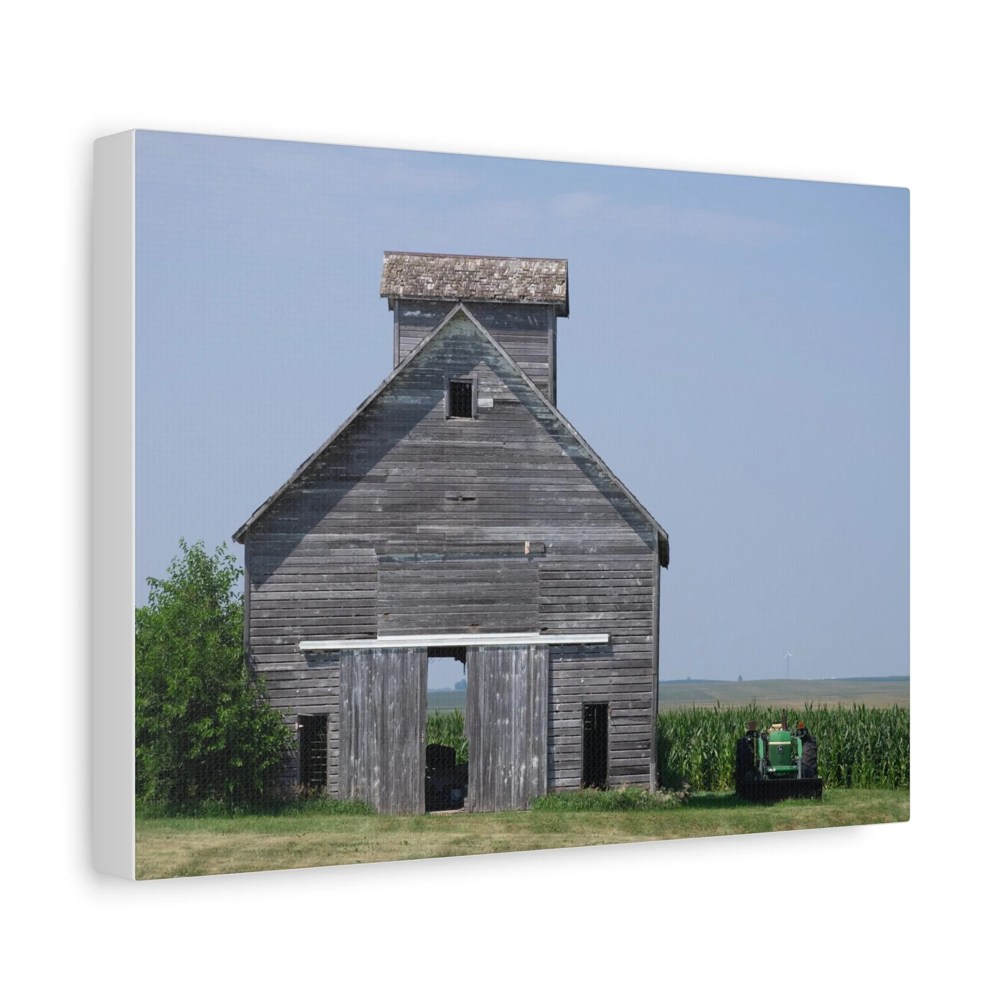 A quiet slice of rural life captured on matte stretched canvas. Weathered wood grain and faded paint draw your eye to the barn’s simple geometry, while a distant tractor and a field of corn anchor the scene in everyday farm work. The muted blues and soft grays keep the mood calm and reflective—this piece brings a sense of slow afternoons, open sky, and the steady rhythm of the countryside into a living room, hallway, or study. Hung flush to the wall with soft rubber supports and built-in back hanging, the print reads like a familiar memory, not a flashy statement. Available in multiple orientations and sizes, it slips easily into rustic, farmhouse, or minimalist interiors where subtle storytelling matters.