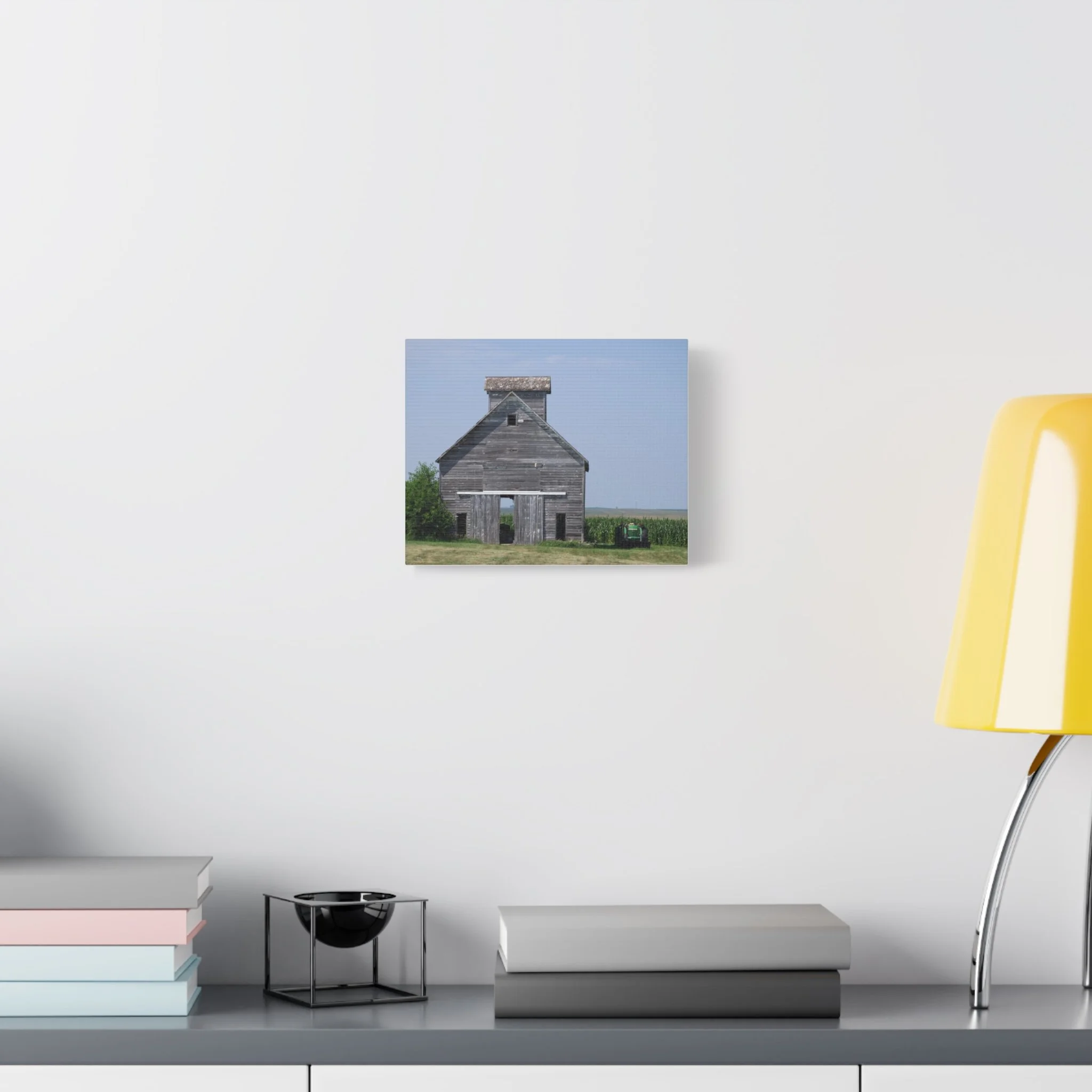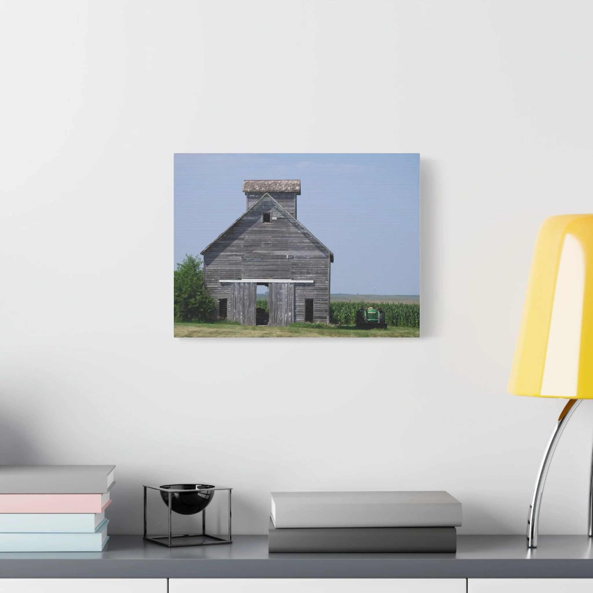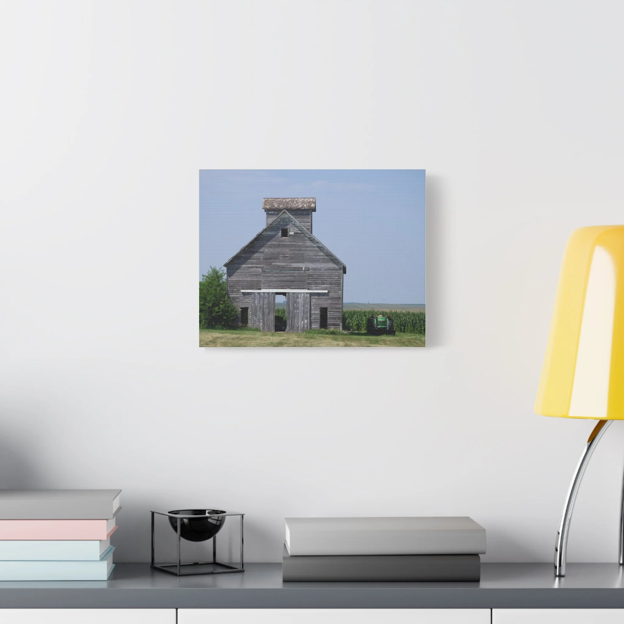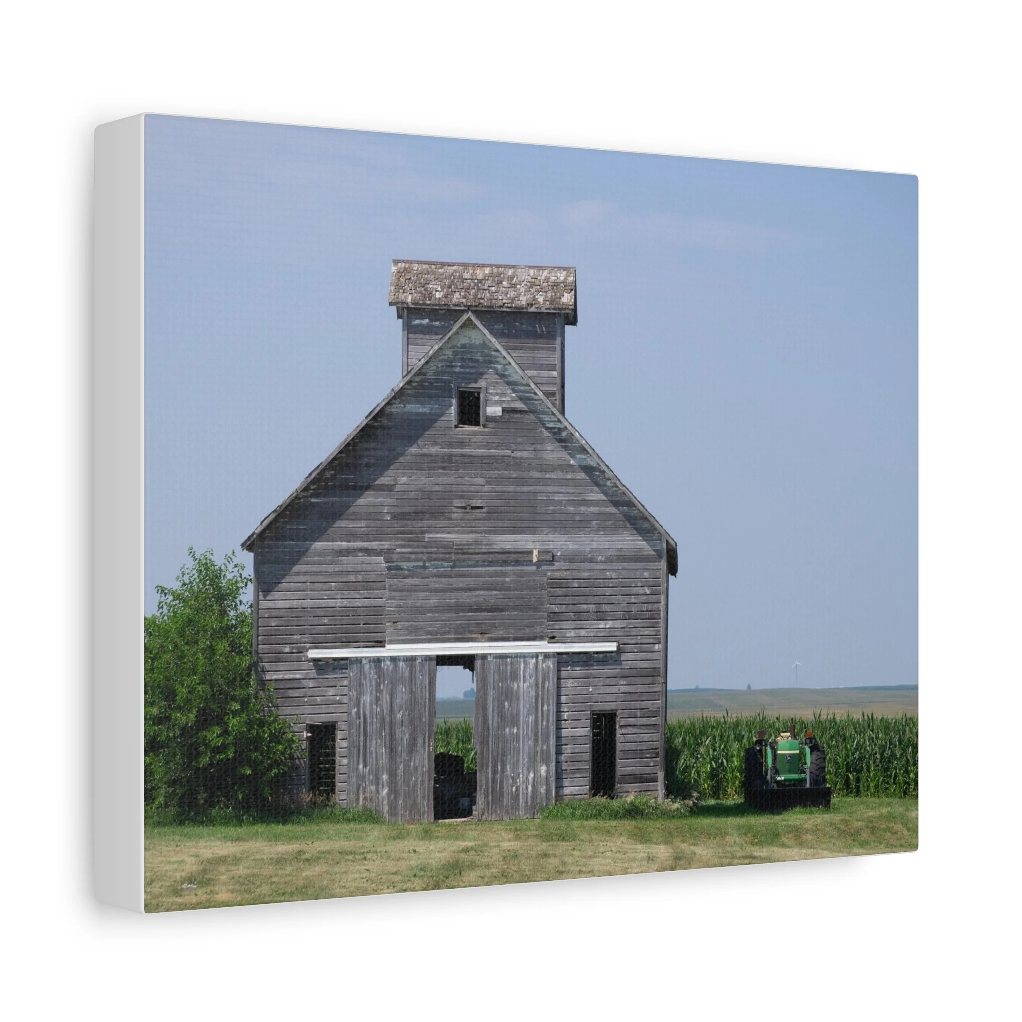 A quiet slice of rural life captured on matte stretched canvas. Weathered wood grain and faded paint draw your eye to the barn’s simple geometry, while a distant tractor and a field of corn anchor the scene in everyday farm work. The muted blues and soft grays keep the mood calm and reflective—this piece brings a sense of slow afternoons, open sky, and the steady rhythm of the countryside into a living room, hallway, or study. Hung flush to the wall with soft rubber supports and built-in back hanging, the print reads like a familiar memory, not a flashy statement. Available in multiple orientations and sizes, it slips easily into rustic, farmhouse, or minimalist interiors where subtle storytelling matters.