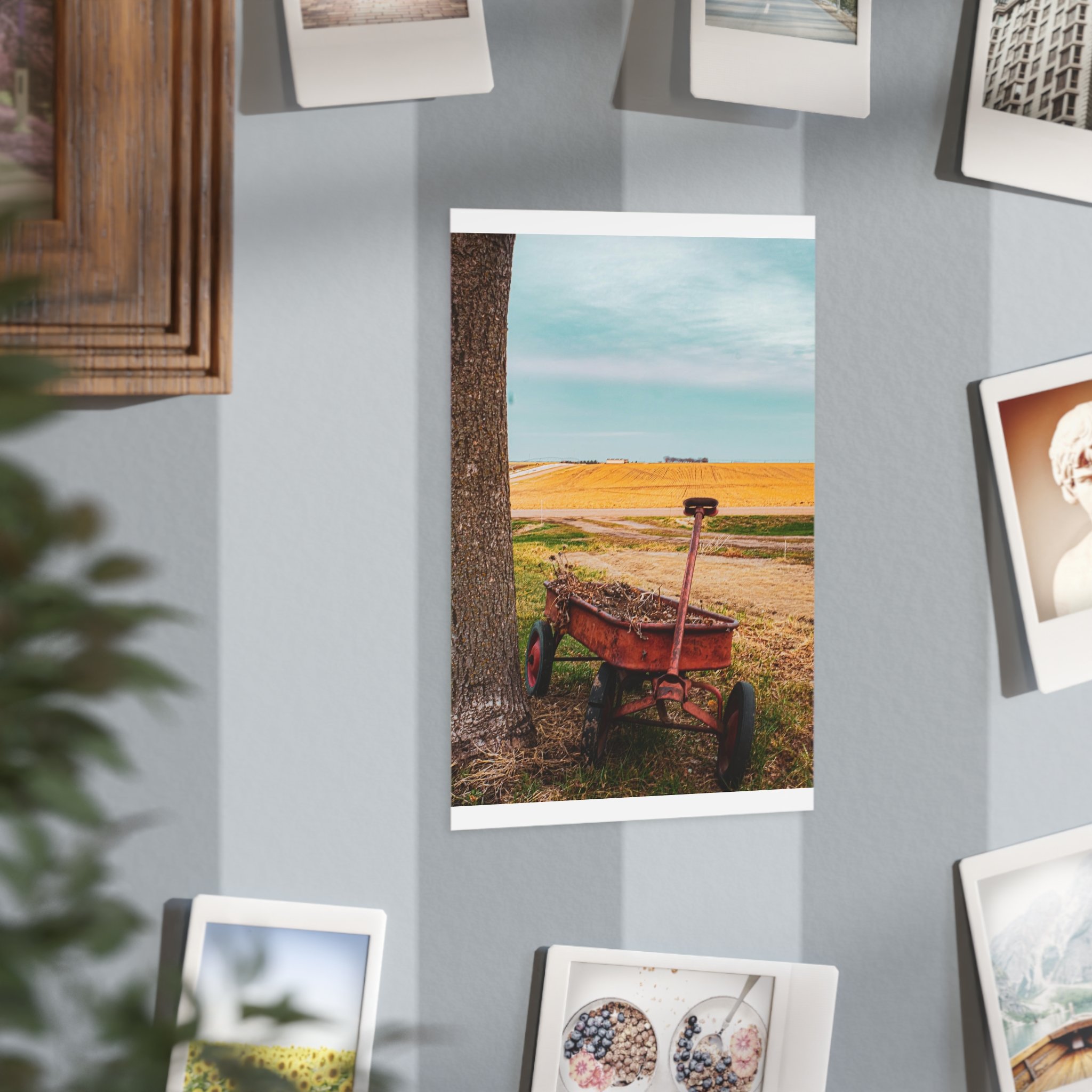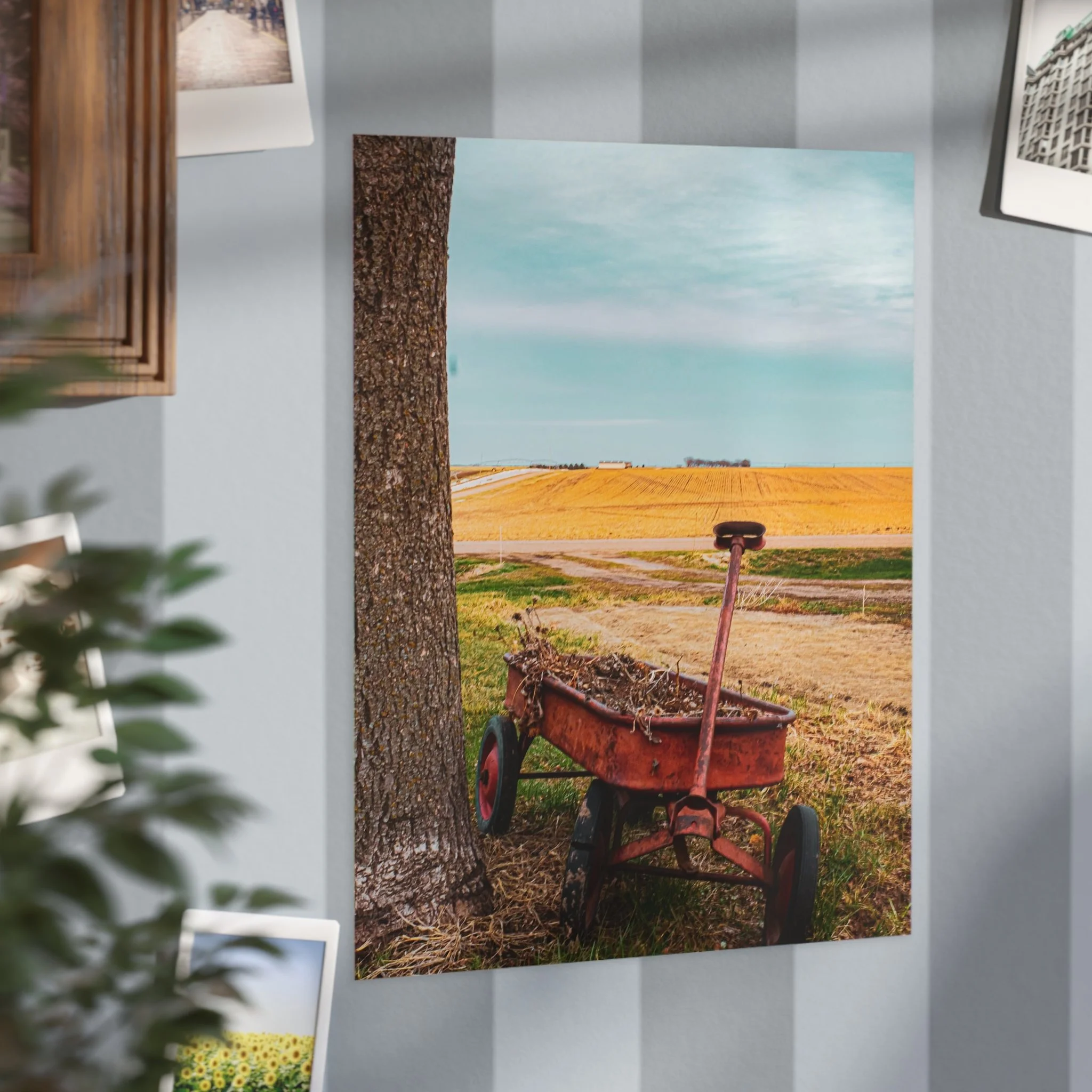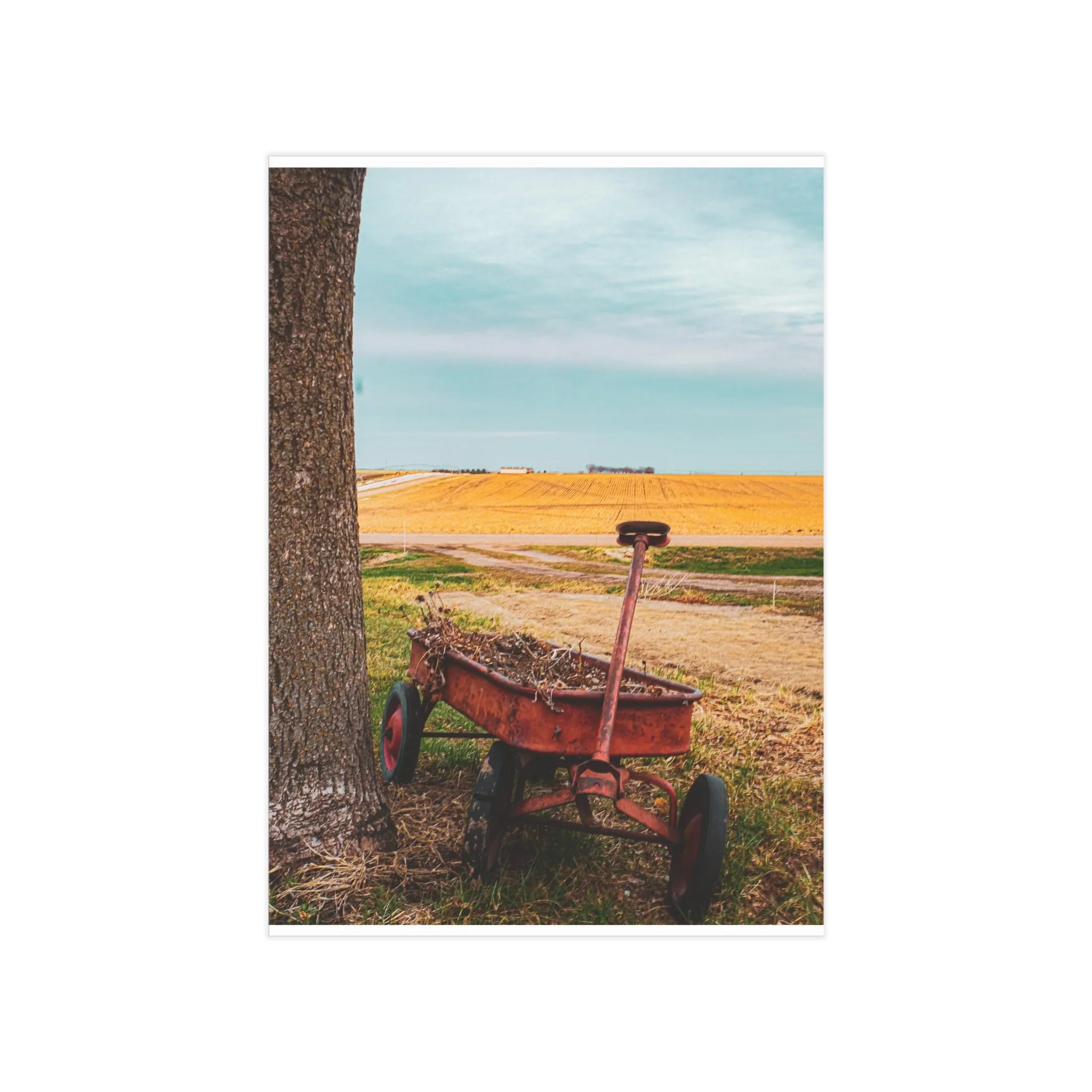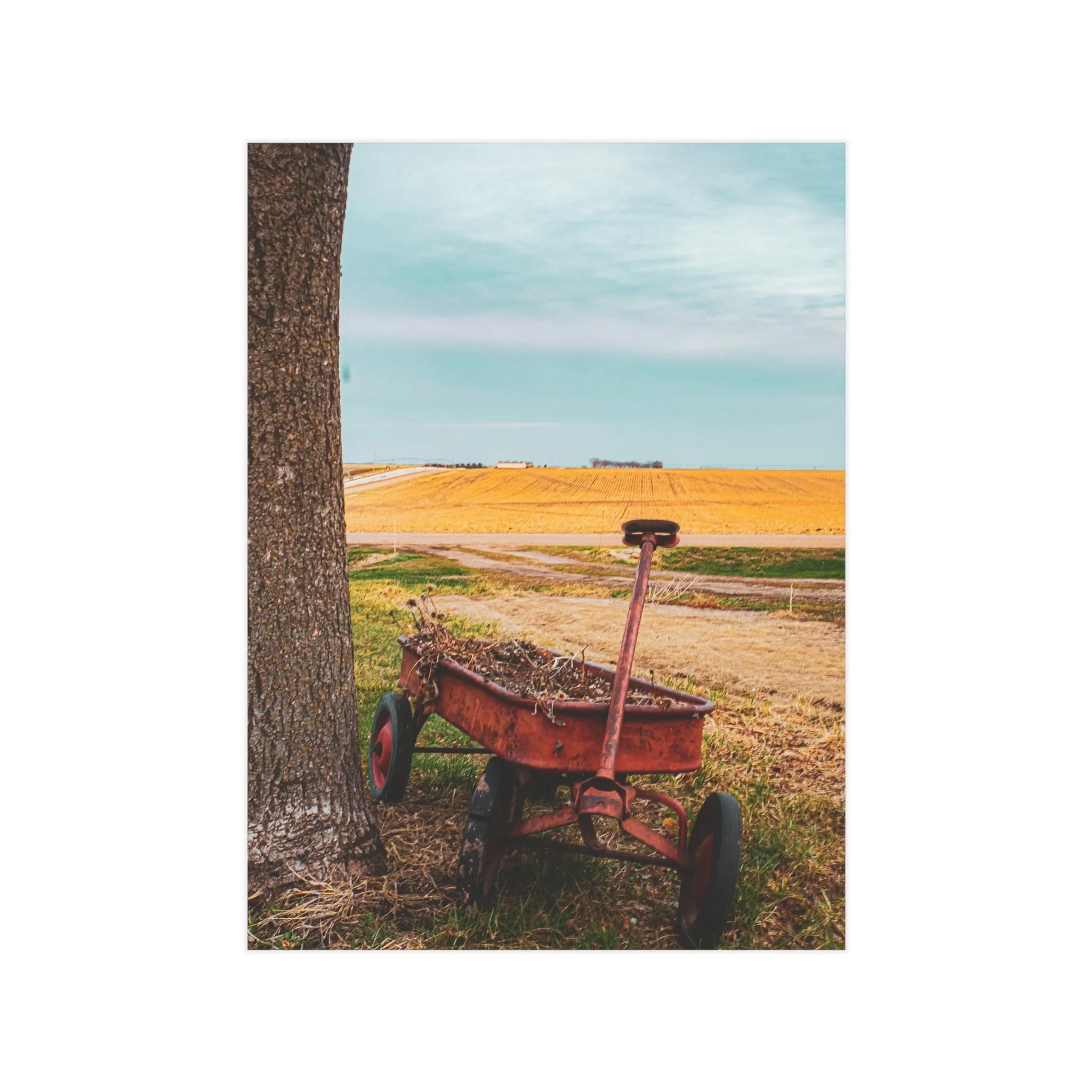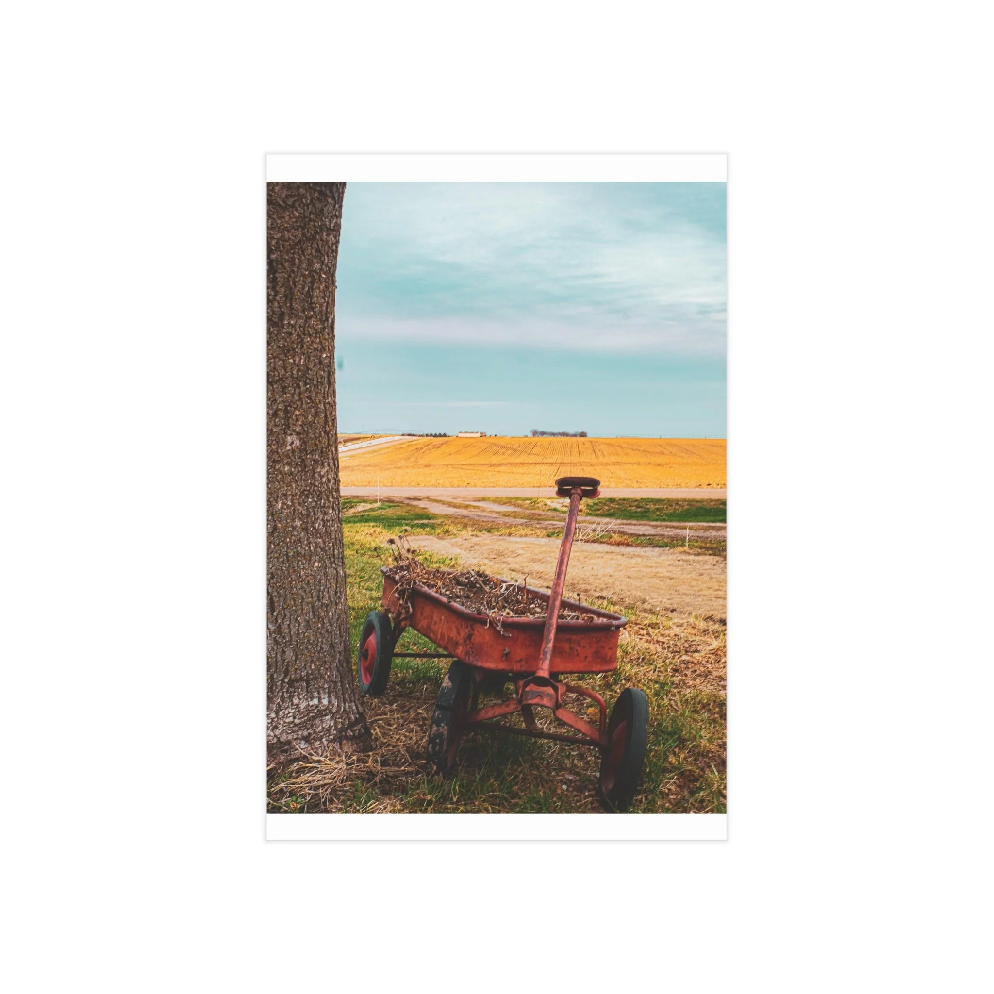 A warm, evocative unframed print that captures a quiet rural moment: an old red wagon leaning against a tree, golden fields stretching to the horizon, and a clear blue sky above. The image brings a slow, thoughtful atmosphere to a room — a reminder of open spaces, late summer light, and the simple things that anchor memory. Printed on sturdy 200 gsm paper with vibrant color reproduction, the piece works beautifully as a standalone vignette on a shelf, arranged in a gallery wall, or slipped into an existing frame to bring a rustic, nostalgic touch to kitchens, home offices, or cozy living rooms.