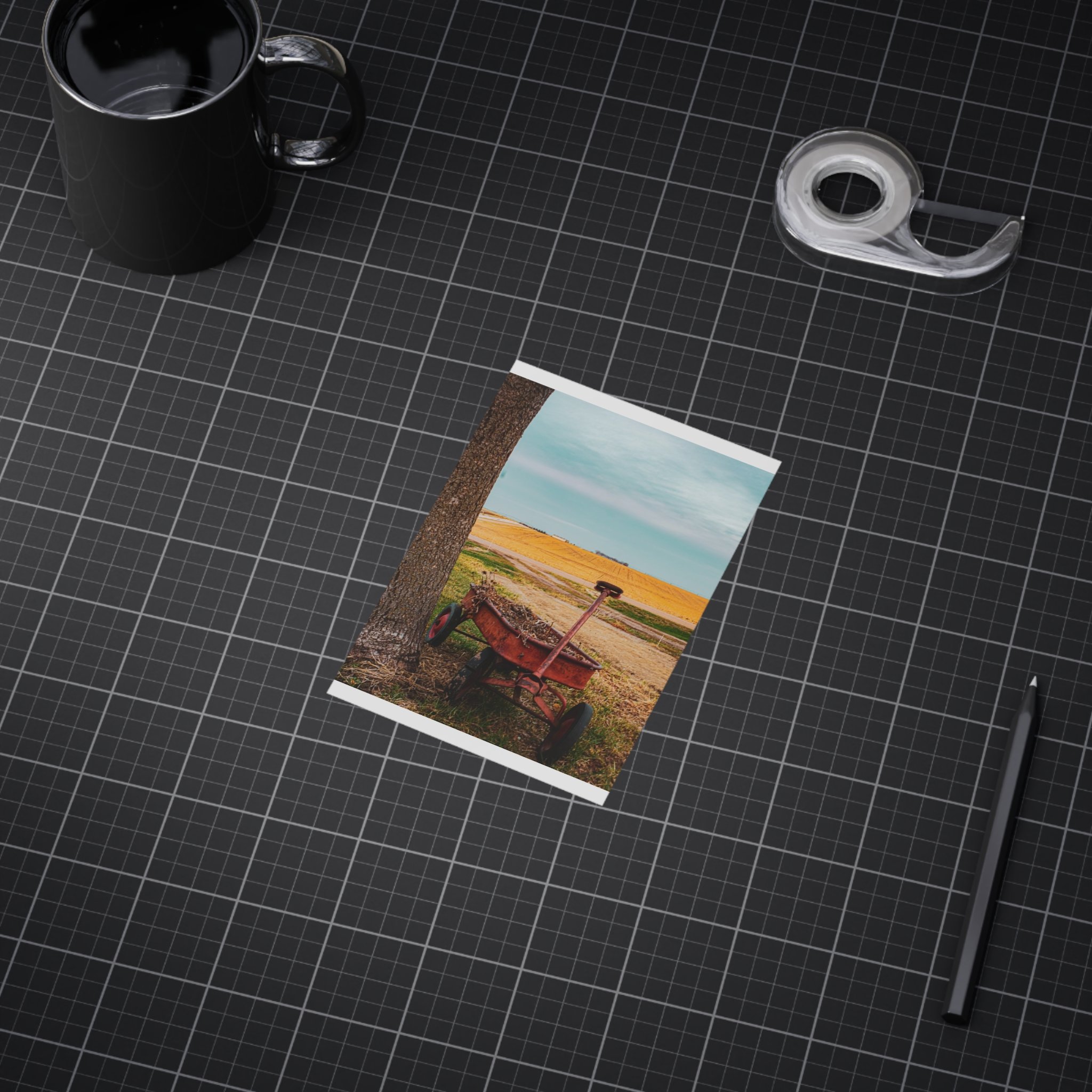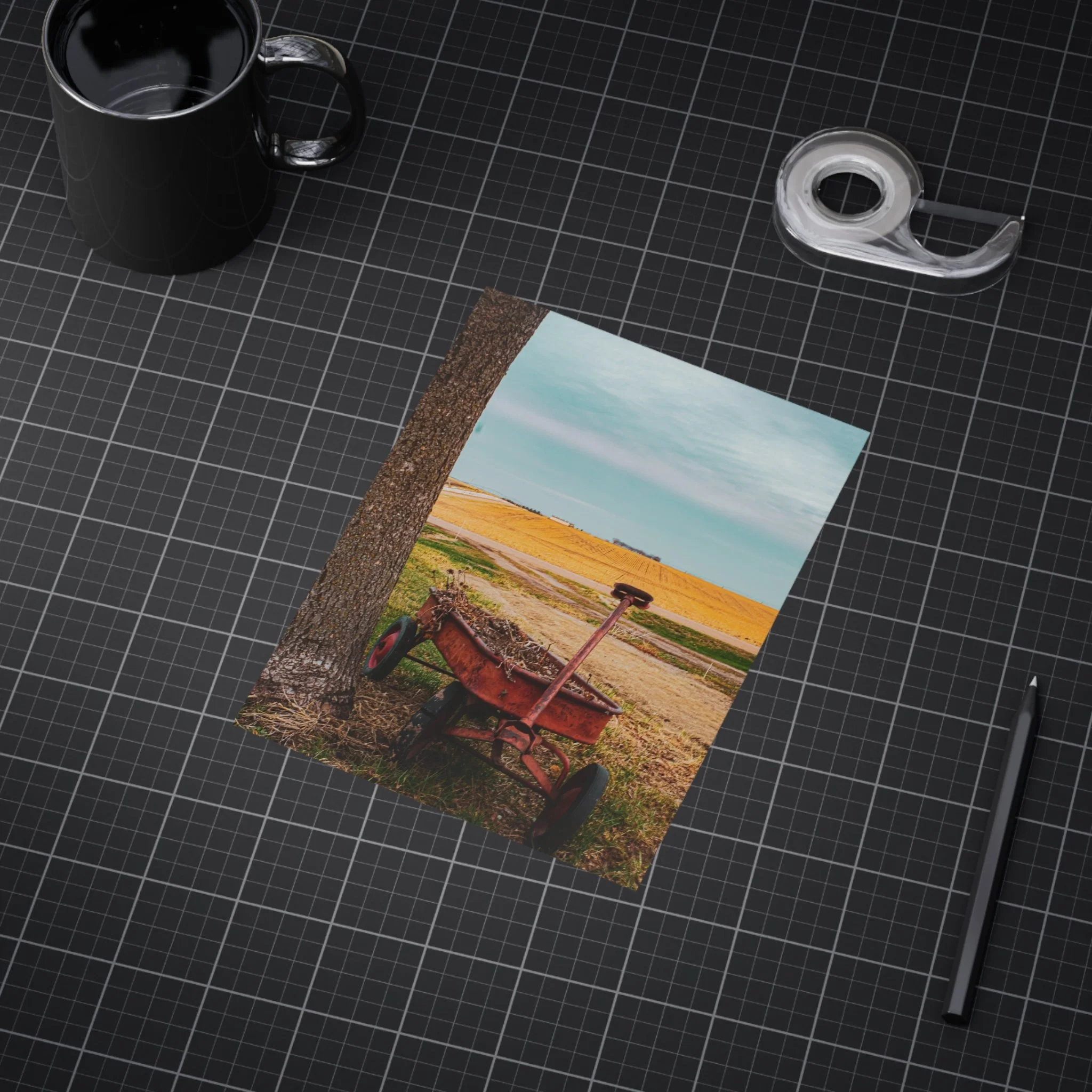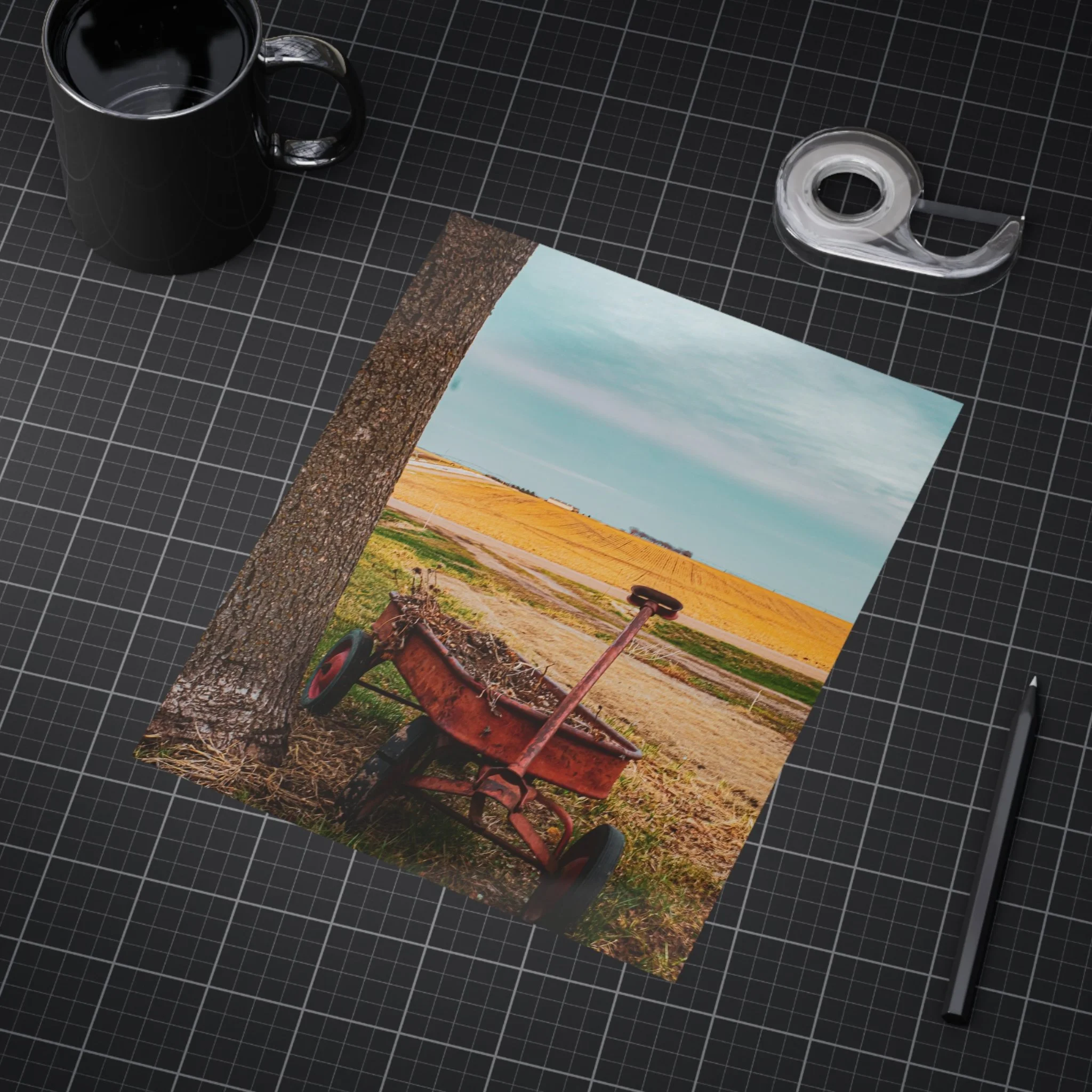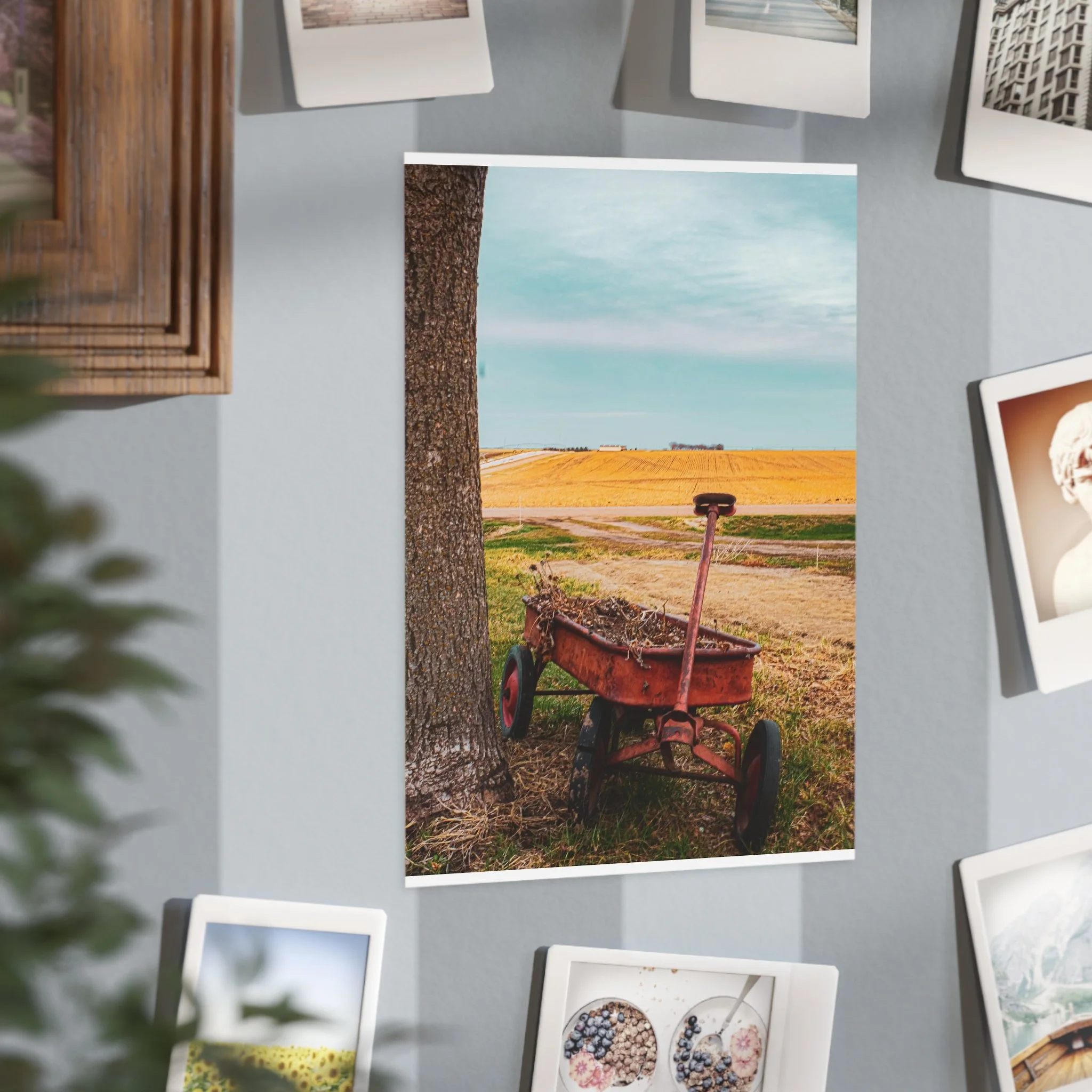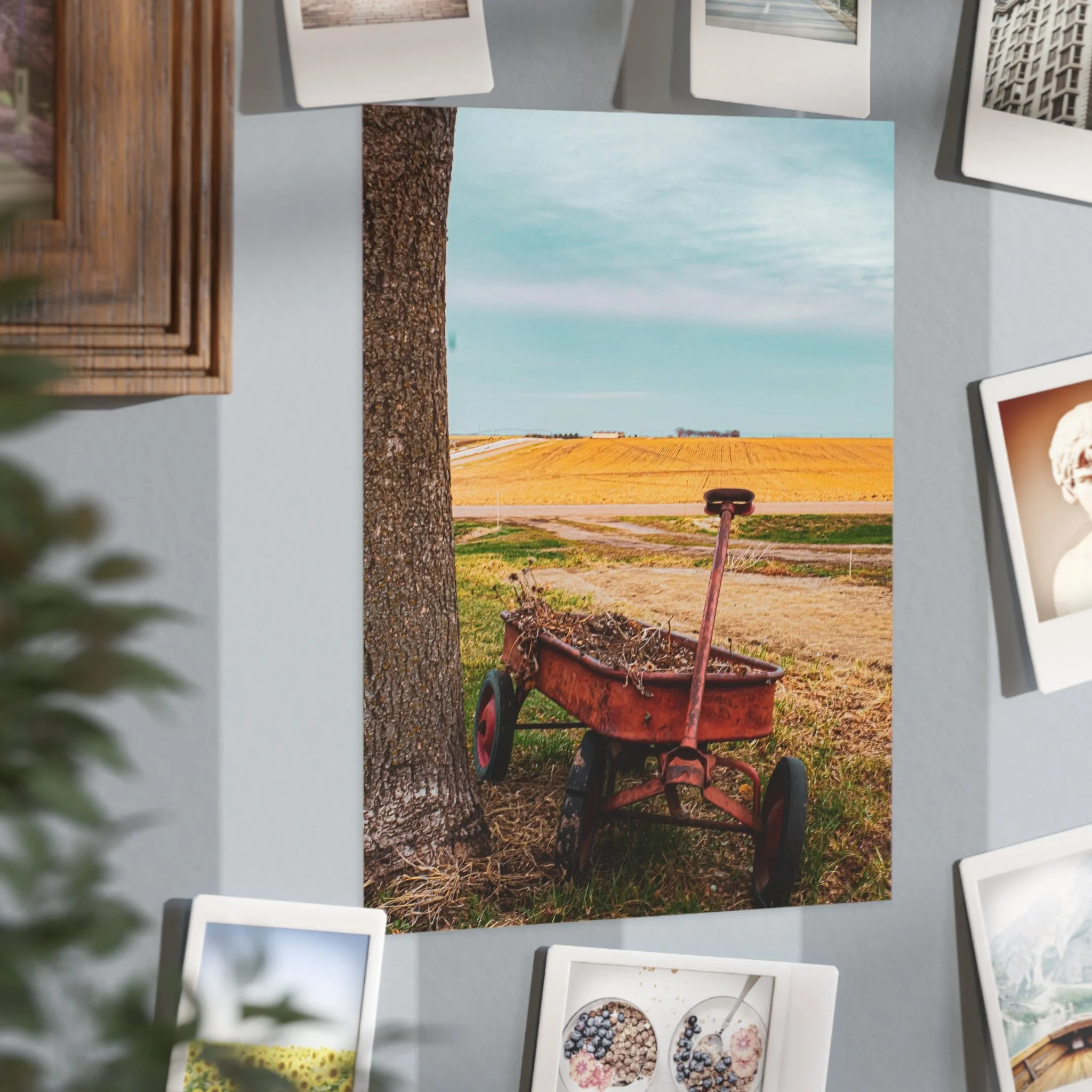 A warm, evocative unframed print that captures a quiet rural moment: an old red wagon leaning against a tree, golden fields stretching to the horizon, and a clear blue sky above. The image brings a slow, thoughtful atmosphere to a room — a reminder of open spaces, late summer light, and the simple things that anchor memory. Printed on sturdy 200 gsm paper with vibrant color reproduction, the piece works beautifully as a standalone vignette on a shelf, arranged in a gallery wall, or slipped into an existing frame to bring a rustic, nostalgic touch to kitchens, home offices, or cozy living rooms.