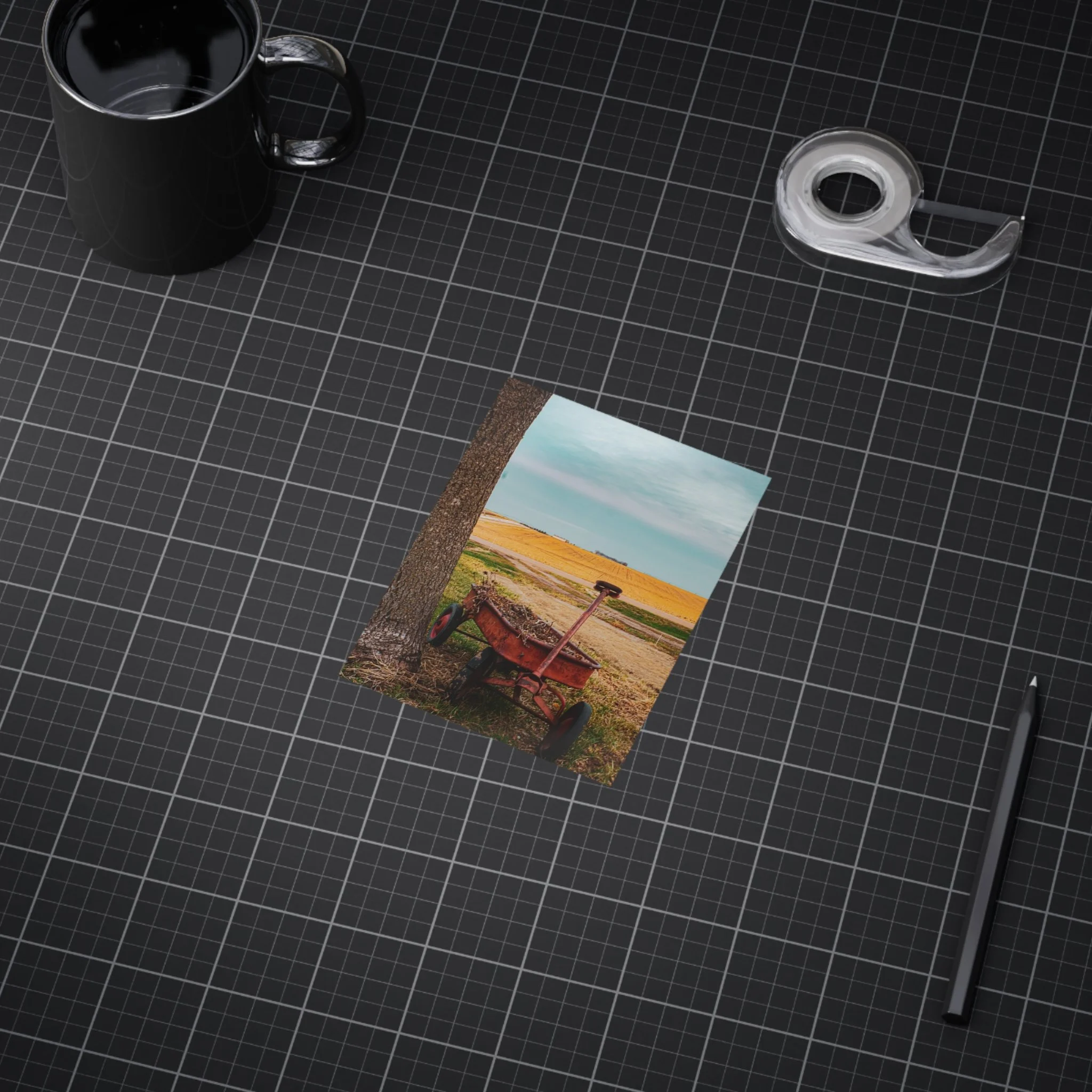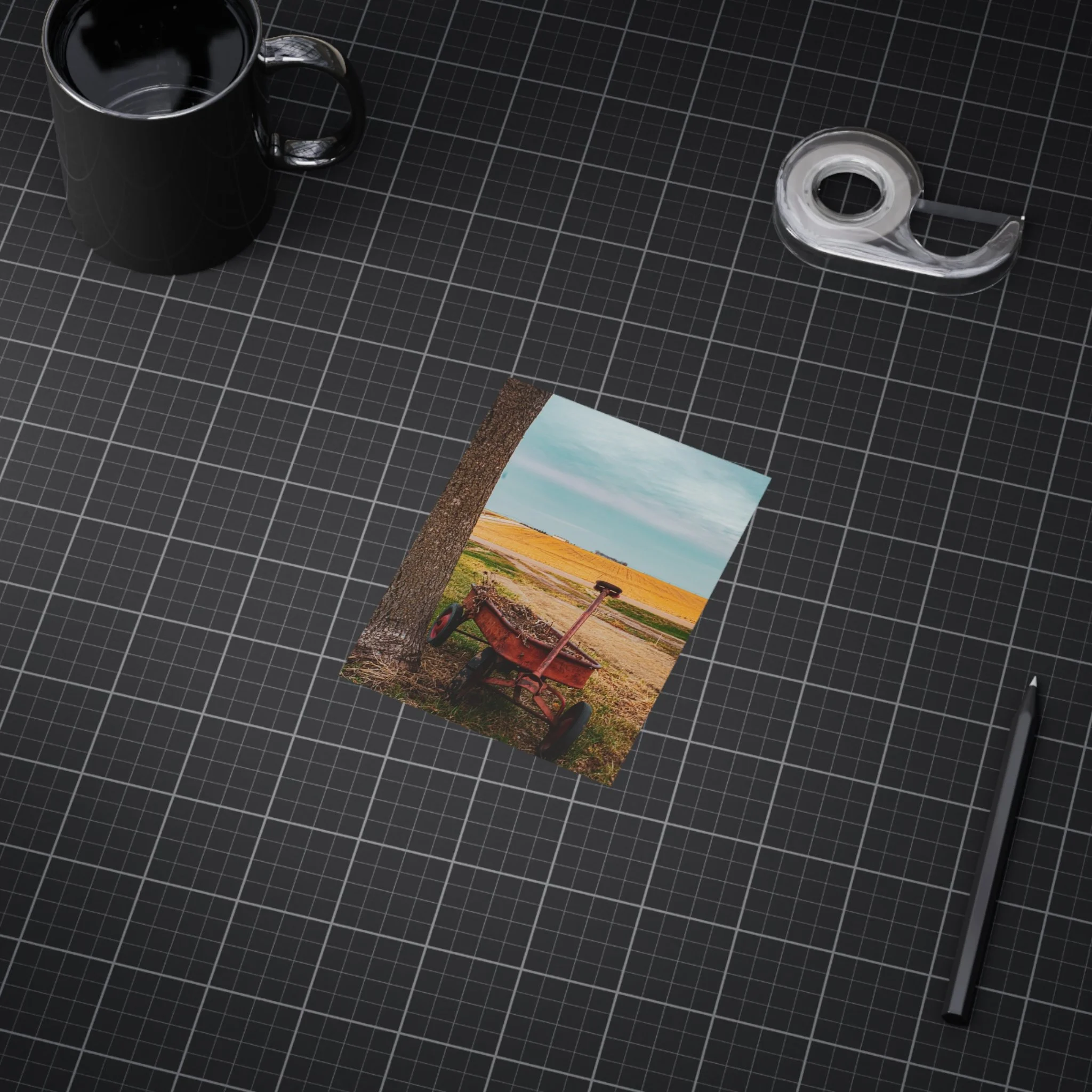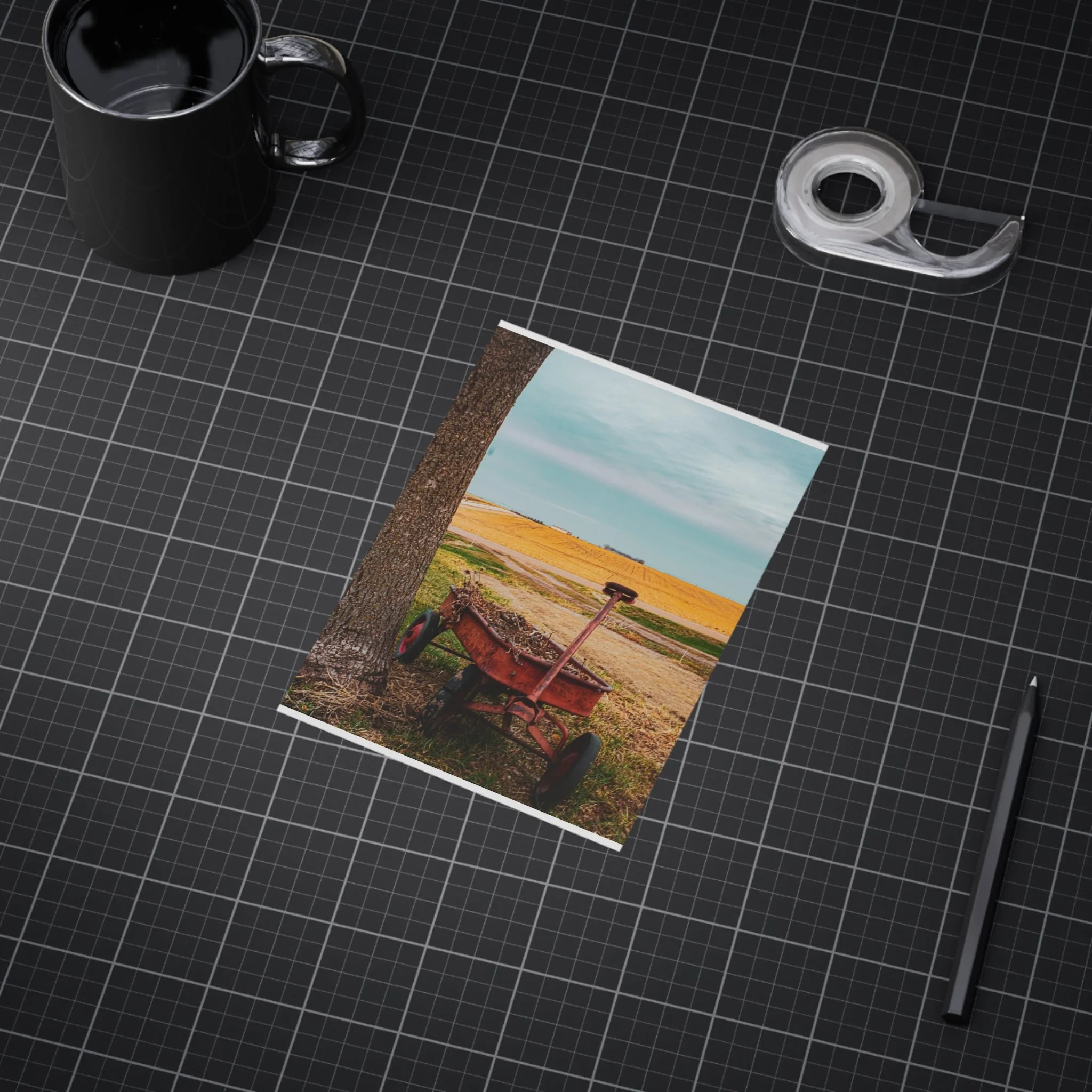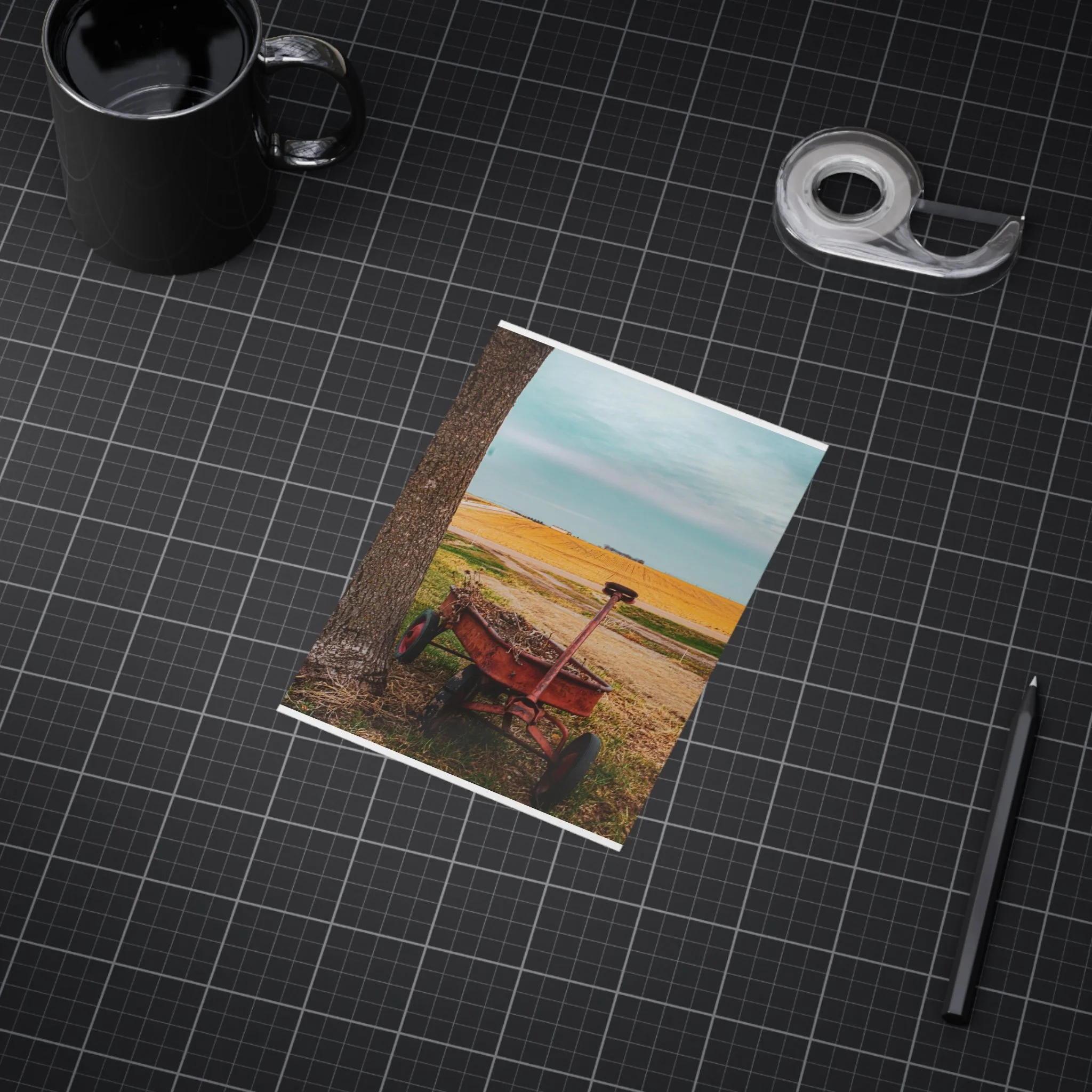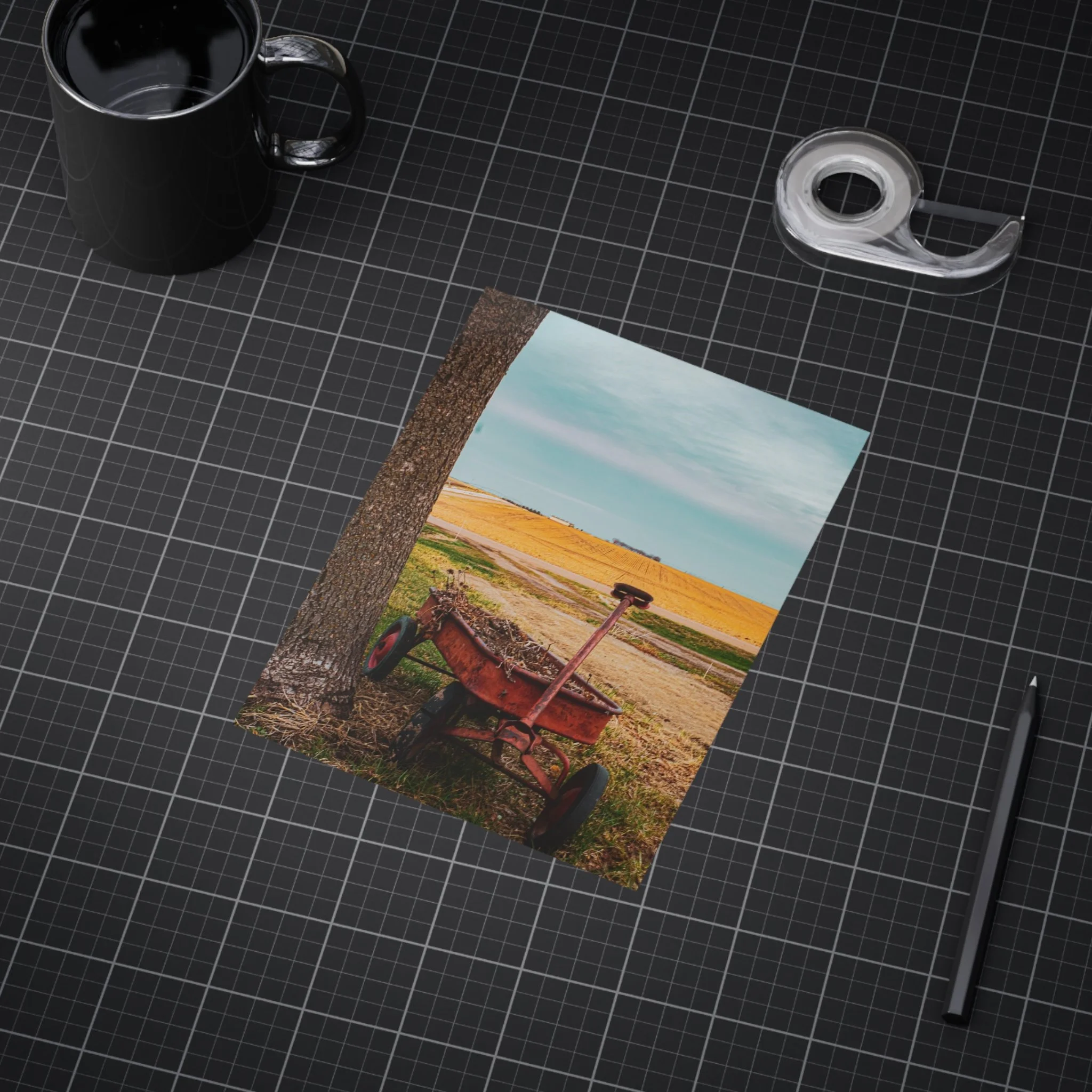 A warm, evocative unframed print that captures a quiet rural moment: an old red wagon leaning against a tree, golden fields stretching to the horizon, and a clear blue sky above. The image brings a slow, thoughtful atmosphere to a room — a reminder of open spaces, late summer light, and the simple things that anchor memory. Printed on sturdy 200 gsm paper with vibrant color reproduction, the piece works beautifully as a standalone vignette on a shelf, arranged in a gallery wall, or slipped into an existing frame to bring a rustic, nostalgic touch to kitchens, home offices, or cozy living rooms.